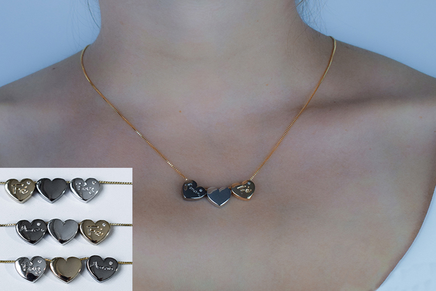 GARGANTILHA EM PRATA, ELO VENEZIANA 0,60mm, 40cm COMPRIMENTO, EXTENSOR 5cm, TRÊS CORAÇÕES, COM BANHO DE RÓDIO BRANCO, COLEÇÃO AURA