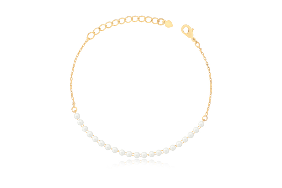 PULSEIRA BANHADA EM OURO, ELO OVAL 1,20mm LARGURA, PÉROLA SHELL 3mm DIÂMETRO, 17cm COMPRIMENTO E EXTENSOR 3cm