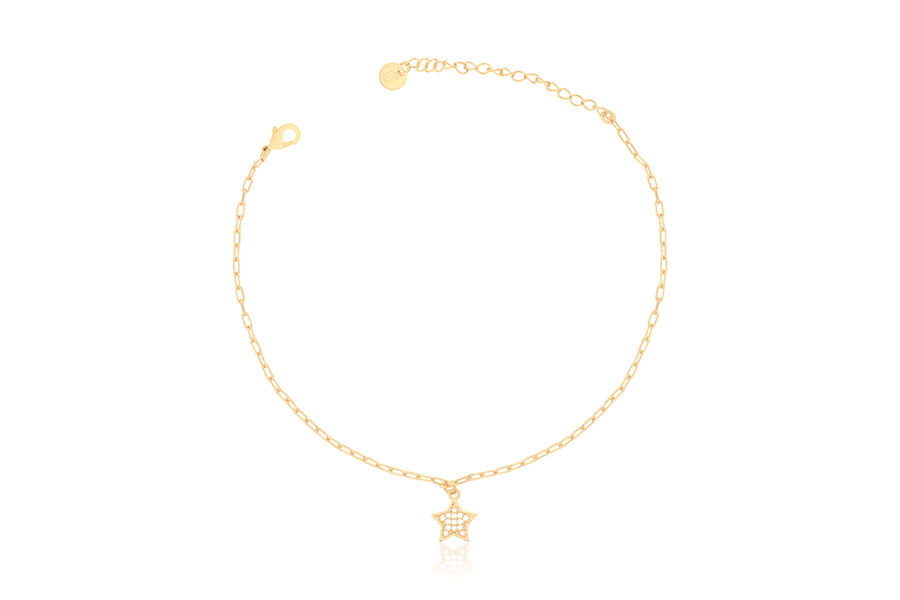TORNOZELEIRA BANHADA EM OURO, ELO CARTIER 4,20x1,90mm, 23cm COMPRIMENTO, EXTENSOR 5cm E ESTRELA 10mm LARGURA